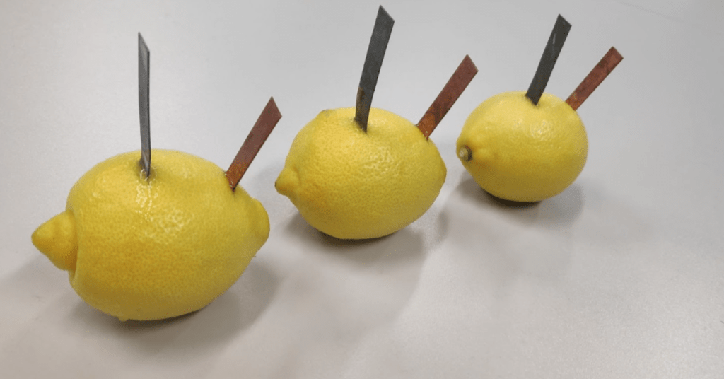 V citronech samozřejmě nemám silnou kyselinu sírovou, ale máme v nich kyselinu citronovou, která ji zde nahrazuje. Jedná se tak o mnohem bezpečnější variantu, než se pokoušet o baterii z kyseliny citronové. Nicméně zde vzniká o to menší proud.