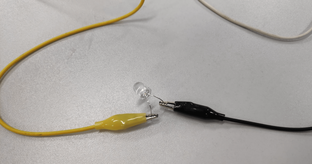 - Pokud dioda nezačne svítit je třeba prohodit konce diod a krokodýlky zapojit každý na druhou nožičku diody. Takto by měl vypadat výsledek: