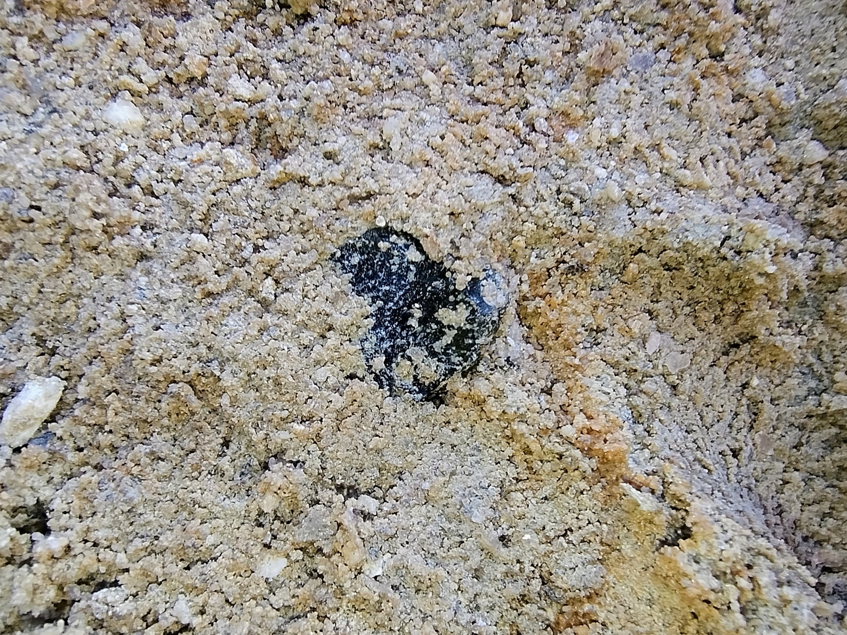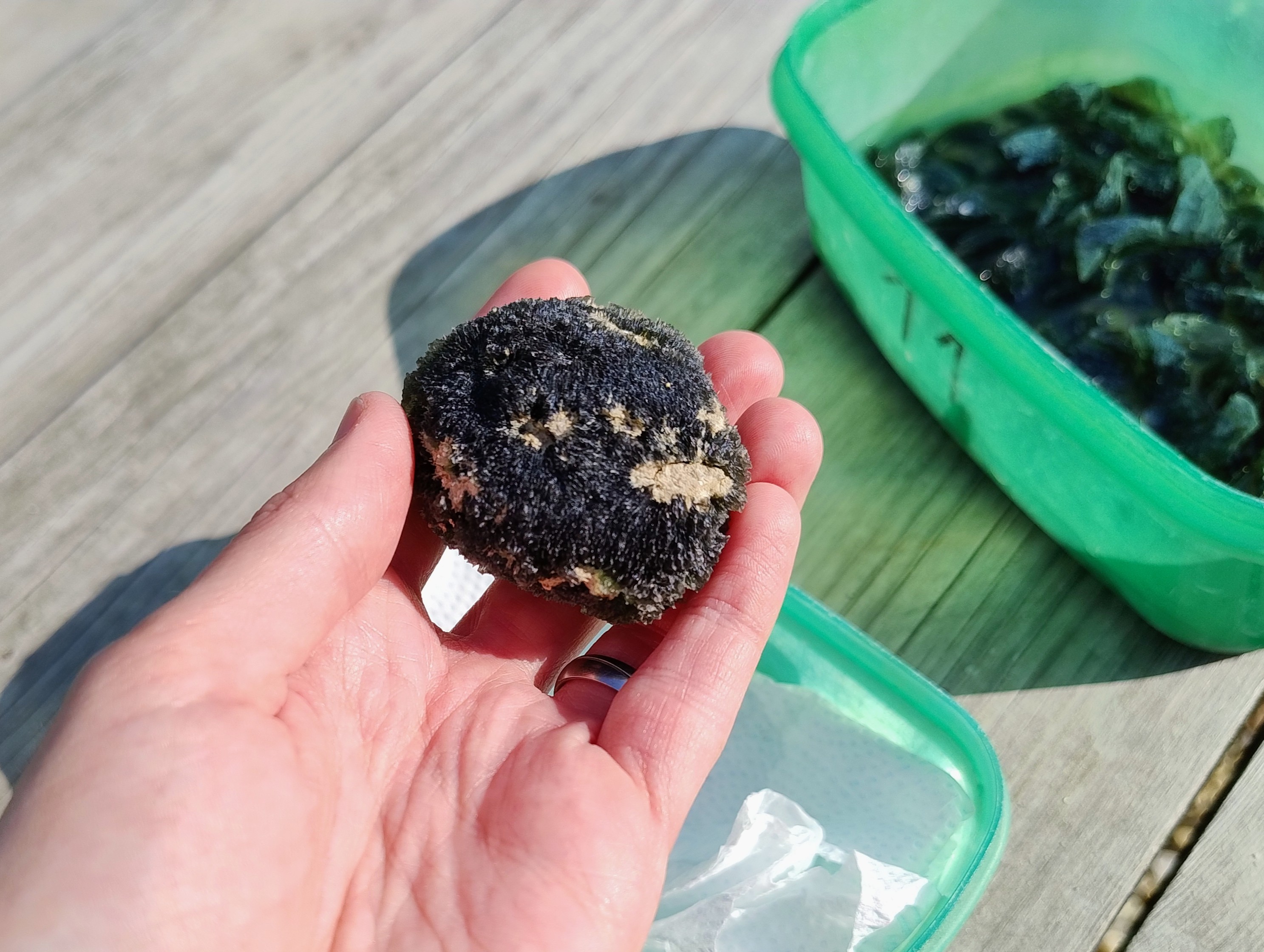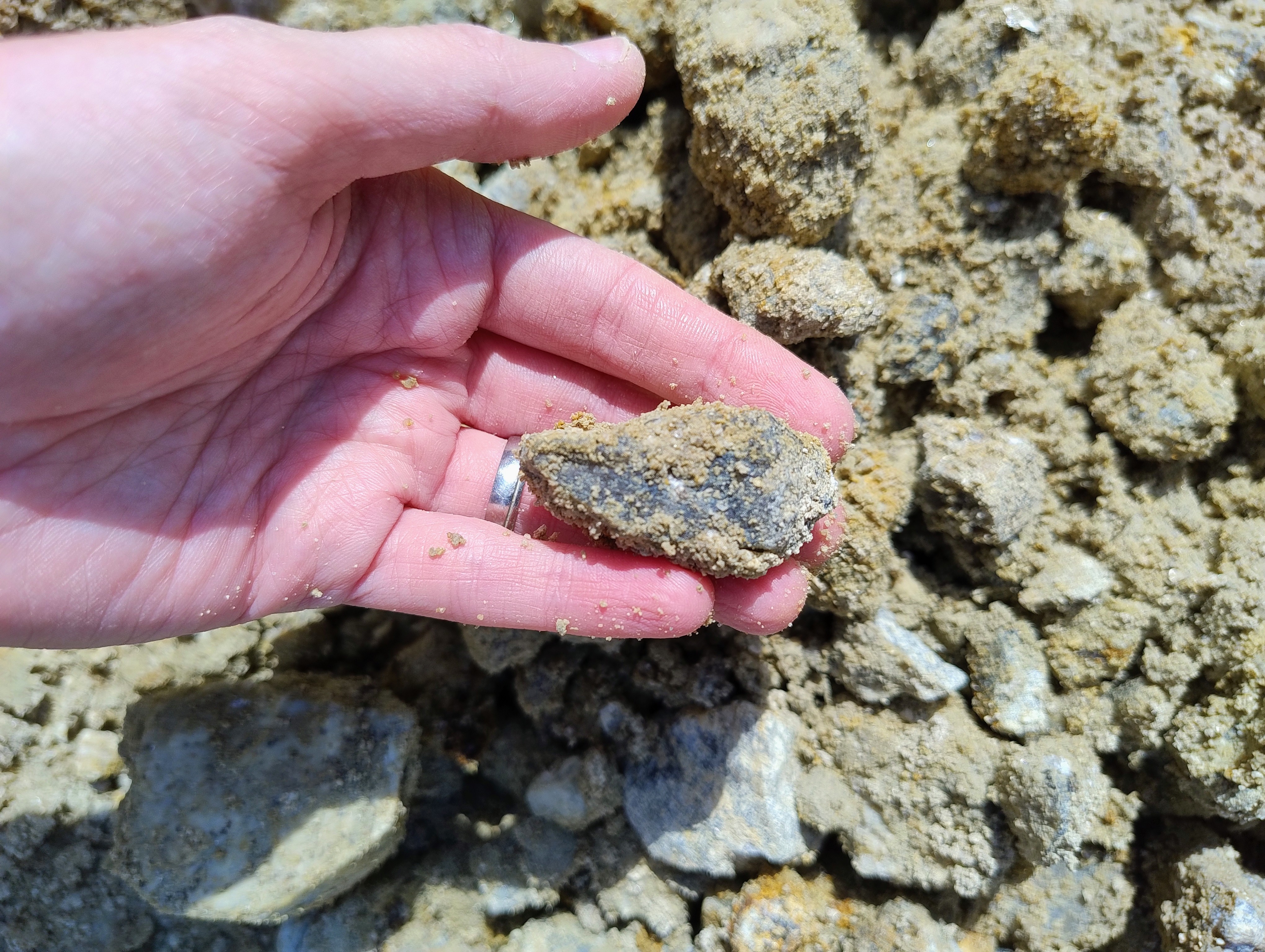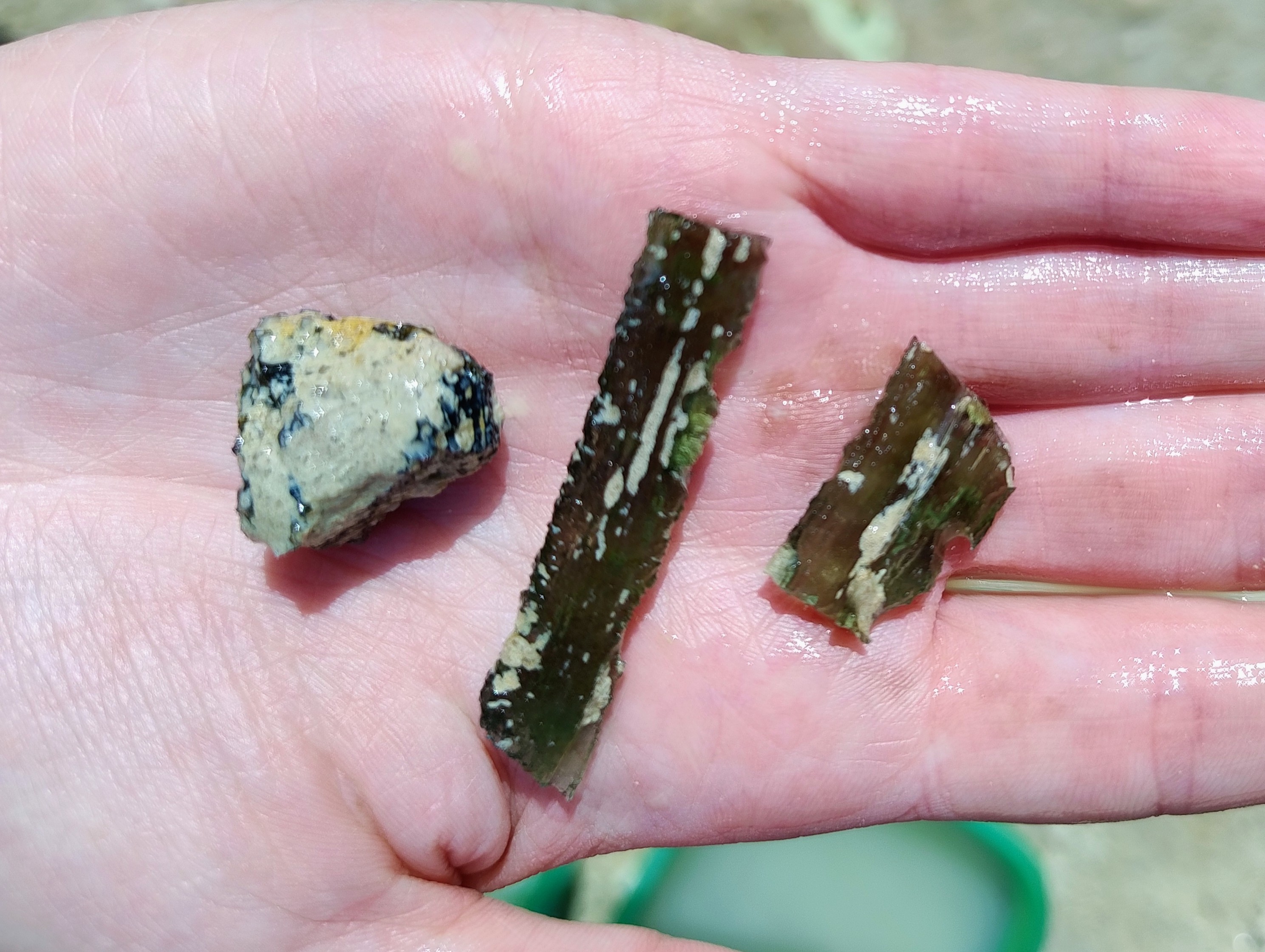 Mistr nám ukazuje, jak s cepínem pracovat a do kterých vrstev mlátit. Skvělá je ta oranžová, plná křemenů. Trvá nám, než se nám konečně začne dařit odsekávat kusy štěrkopísku od stěny. Lítají jiskry, cítím štiplavý pach pukajících horkých křemínků. A tu mi po prohrábnutí materiálu přistává v ruce, ano, mám ho, jen pár minut po startu! Ačkoliv mě nabudilo nadšení, brzy odpadám. Je to fyzicky mnohem náročnější, než jsem čekala, takže mě střídá Tom. Raději pak se stejnou vervou prohledávám pomalu narůstající haldu štěrkopísku a rozmělňuju jakékoliv větší slepence. Už jsem ji chytla, už mi není pomoci. Zelená horečka. Stěží se odtrhávám, abych udělala alespoň pár fotek.