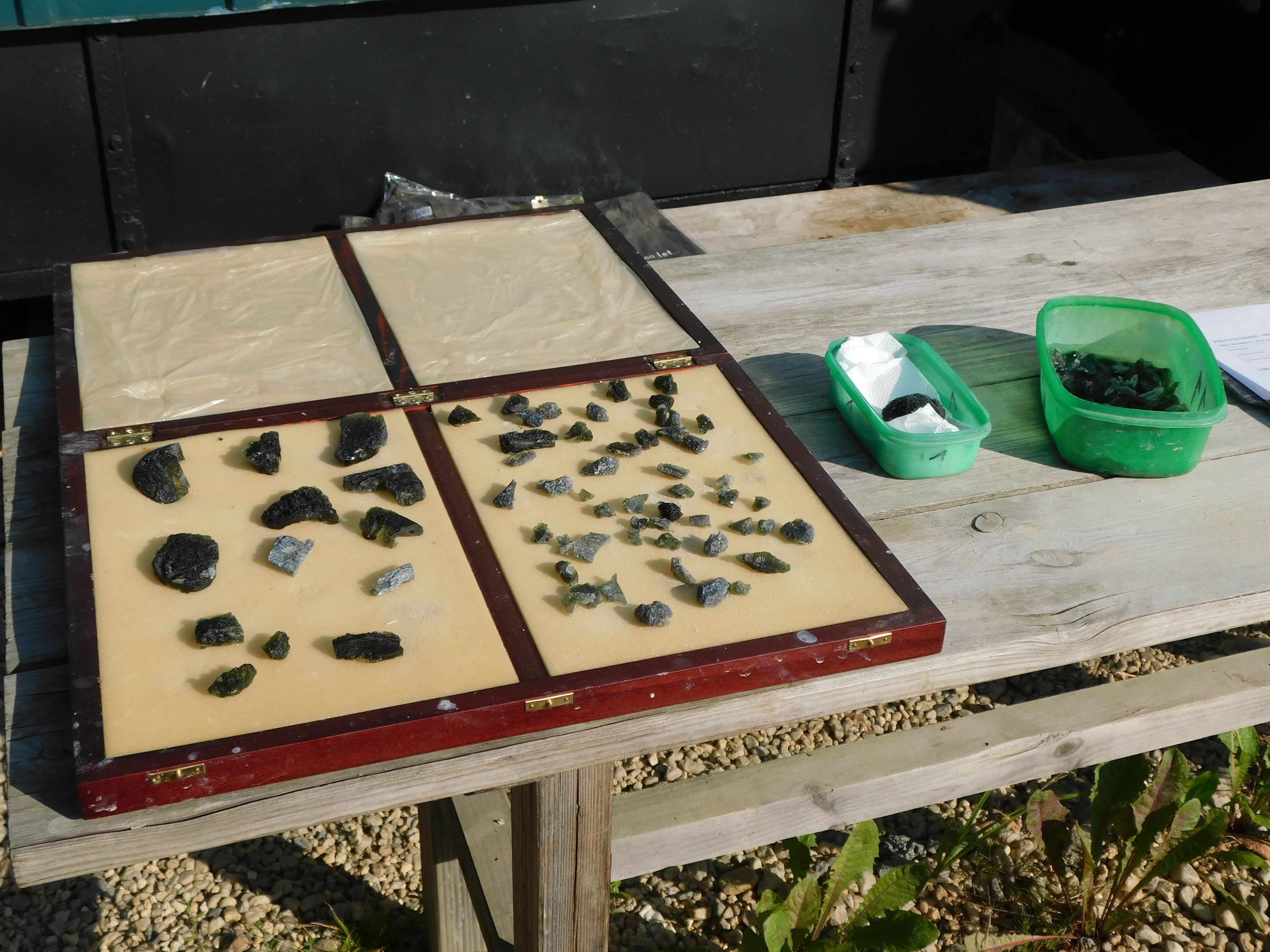 Pracovníci nám ukazují kazetu plnou místních pokladů nejrůznějších velikostí a tvarů. Vedle na stole se v plastové krabičce odmáčí spousta menších zelených nalezenců. Jsou tu k dispozici pro ty, kteří by měli při kopání opravdu velikou smůlu, a nenašli ani těch pět zaručených gramů v ceně zážitku. Ale úplně tím nejzajímavějším kouskem je výjimečně velká a nádherně skulptovaná pecka. “Vykopal ji tu malý kluk, dost chudák brečel, když ji tu musel nechat.” Totiž, taková pecka bude mít hodnotu snad přes 200 000 Kč! A takové peníze každý po ruce nemá. “Možná půjde do Muzea vltavínů.”