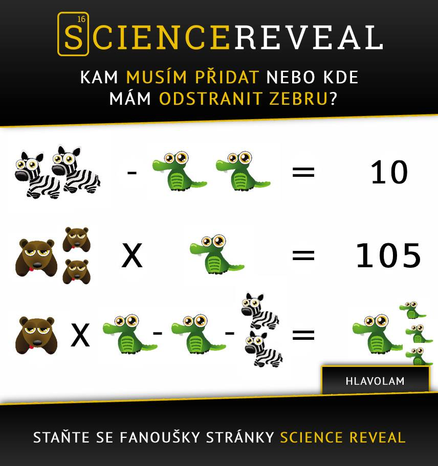 Zvláště v dnešní době je třeba mozek trošku trénovat, tak jsme si na sobotní večer pro vás připravili jednoduchou hádanku. Dokážete přijít na to, do/z kterého místa těchto tří rovnic je třeba přidat, nebo odebrat právě jednu zebru tak, aby všechny tři rovnice platily?
