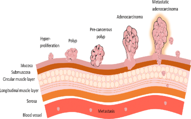 Kolorektální karcinom vzniká při poruše buněčné regulace. Buňky se začnou nekontrolovaně množit a vznikne tak nádorová tkáň. (Dalal et al., Biomedicine and Pharmacology, 2020).
