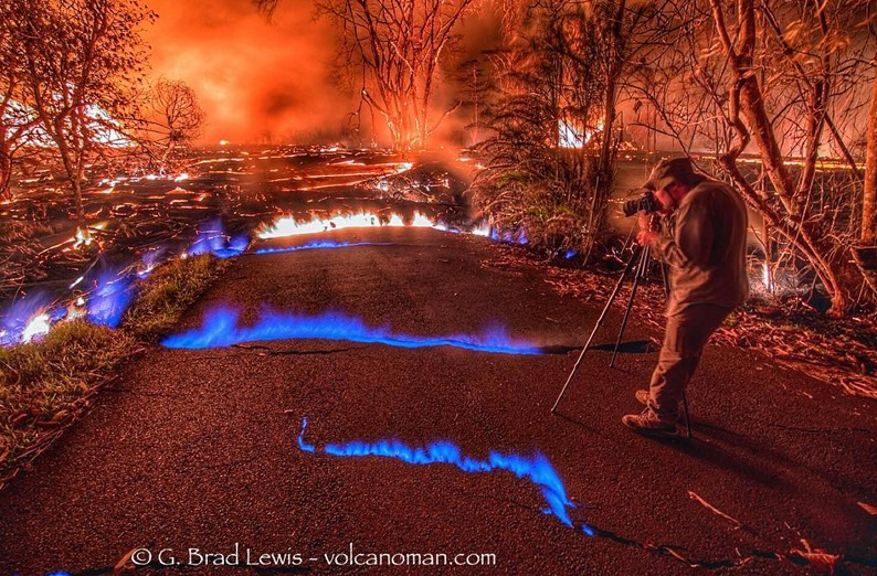 V pozadí si můžete všimnou valící se lávy, která se pomalu přibližuje k fotografovi. Ten svůj pohled nyní zaměřuje na plameny, které šlehají ze země. Modré prameny způsobuje unikající methan, který uniká skrze pukliny vzniklé při erupci. Methan se postupně uvolňuje z podzemí a pokud je na povrchu zažehnut, tak má takovouto krásnou barvu.