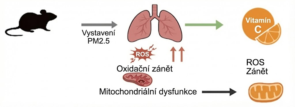 Vědci zkoumali myši vystavené jemným prachovým částicím, z nichž některým byl také podáván vitamín C. (Bai et al., Environ. Int., 2025)