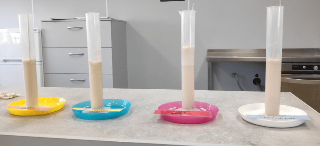 V 1. válci (zleva) jsou kvasinky v teplé vodě, v 2. válci jsou kvasinky ve studené vodě, ve 3 válci jsou kvasinky v teplé vodě s cukrem a ve 4. válci jsou kvasinky ve studené vodě s cukrem).