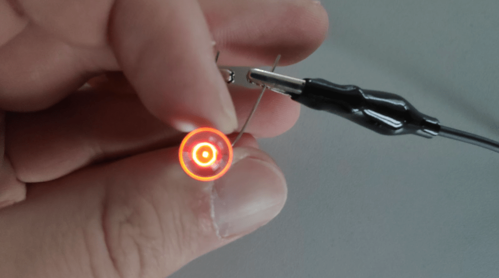 - Pokud dioda nezačne svítit je třeba prohodit konce diod a krokodýlky zapojit každý na druhou nožičku diody. Takto by měl vypadat výsledek: