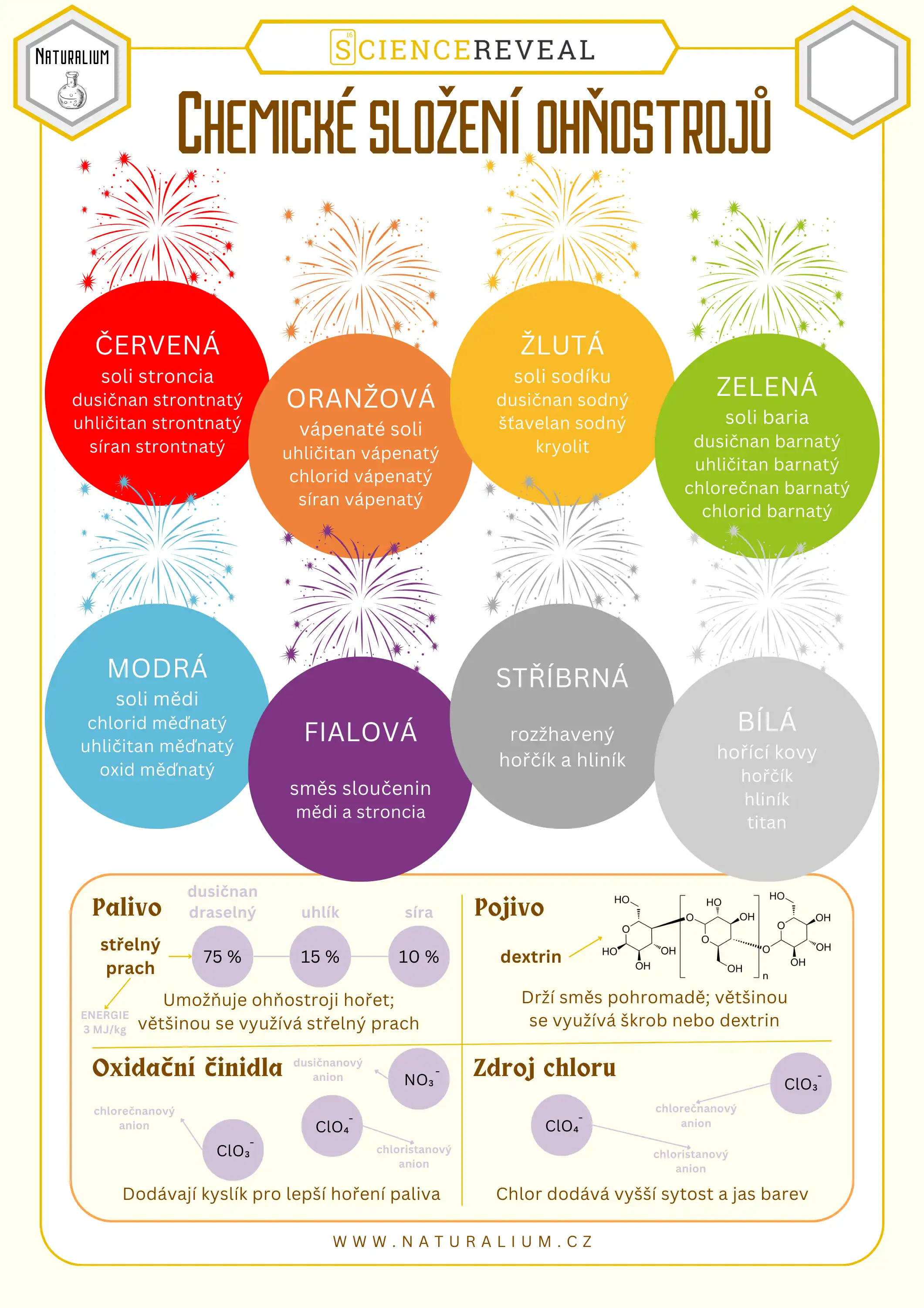 Chemické složení ohňostrojů. Tento obrázek je možné volně šířit s uvedením zdroje. Jedná se o část z naší připravované virtuální učebnice pro základní školy a gymnázia. Pokud byste její rozvoj chtěli podpořit finančně, staňte se našimi patrony na Patreonu.