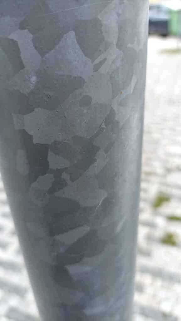Samotné sloupy se vyrábějí z docela obyčejné oceli, protože na ně nemáme žádné velké požadavky. Nemůžeme však takový ocelový sloup nechat stát venku na dešti, protože by rychle zkorodoval a neměl by dlouhou životnost. Proto se pokrývá bariérou, která zabrání tomu, aby ocel přišla do styku se vzdušnou vlhkostí a korodovala. V Česku se nejčastěji setkáte s pozinkovanými sloupy - to znamená, že na ocelový sloup se jako ochrana nanese tenoučká vrstva zinku. Celý povrch sloupu se ale nepokryje atomy zinku naráz. Nejprve se na několika náhodných místech usadí první atomy, kolem kterých se pak usazují další atomy a tvoří krystaly. Výsledkem toho, je že zinkový povrch není jednolitý, ale složený z mnoha a mnoha krystalických zrn. A právě tato zrna tvoří onu mozaiku na povrchu sloupů. Každé zrno má také trochu jinou orientaci krystalů, což způsobuje, že se od něj trochu jinak odráží světlo a my ho vidíme v jiném odstínu šedé.