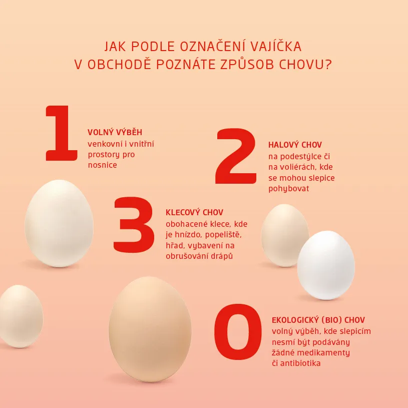 Zatím se můžete i vy v Česku rozhodnout, jaká vejce a z jakých chovů budete kupovat a vyvinout tak tlak na farmy, aby změnily podmínky, za kterých slepice chovají - stačí se podívat na číselné označení přímo na vejcích. Zdroj CSAS.cz.