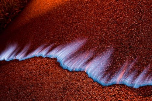 V pozadí si můžete všimnou valící se lávy, která se pomalu přibližuje k fotografovi. Ten svůj pohled nyní zaměřuje na plameny, které šlehají ze země. Modré prameny způsobuje unikající methan, který uniká skrze pukliny vzniklé při erupci. Methan se postupně uvolňuje z podzemí a pokud je na povrchu zažehnut, tak má takovouto krásnou barvu.