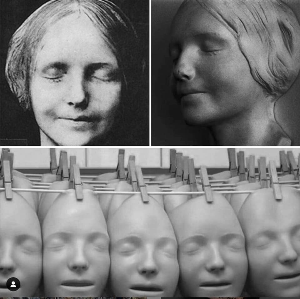 Toto je POSMRTNÁ MASKA mladé ženy, která se utopila v řece Seině v 80. letech 19. století. V té době bylo zvykem vystavovat těla neznámých zesnulých v pařížské márnici v naději, že je někdo pozná a přihlásí se k nim. Patolog, který měl službu, byl fascinován dívkou s tajemným polovičním úsměvem a nechal z její tváře vyrobit sádrový odlitek. Tato maska byla mnohokrát replikována a dívka se stala známou jako „L'Inconnue de la Seine“ – „Neznámá žena ze Seiny“.