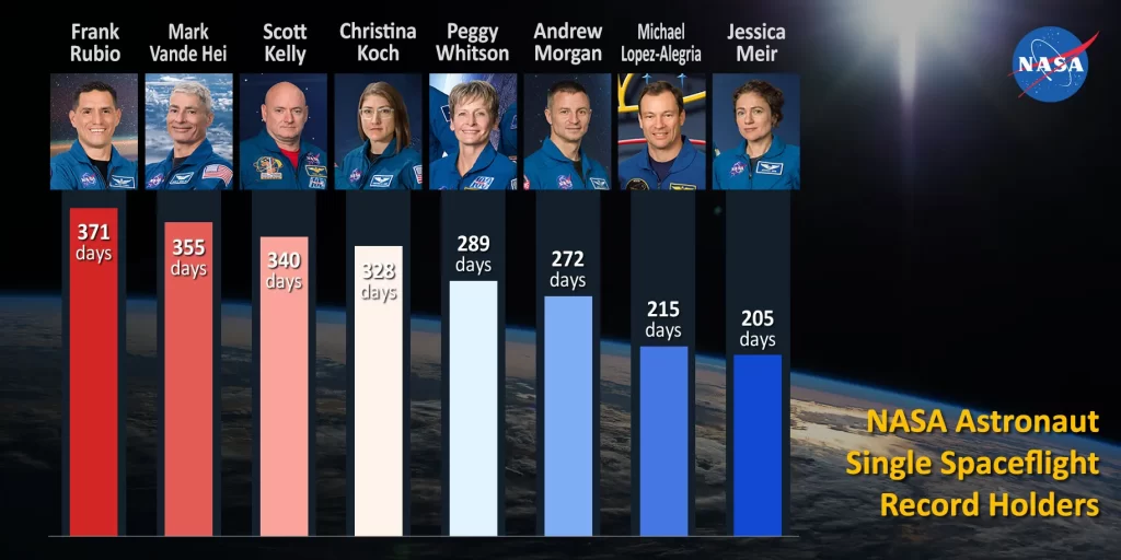 Na ISS se trvale vyskytují lidé od 2. 11. 2000. Běžná mise na ISS trvá přibližně půl roku, ale i zde se nachází výjimky. Rekord drží Frank Rubio, který zde strávil 371 dní, v těsném závěsu jsou pak Mark Vande Hei a Scott Kelly, o kterém jsme již psali v minulosti. Za zmínku stojí ale také Peggy Whitson, která dohromady ve vesmíru strávila 655 dní v rámci několika misí.